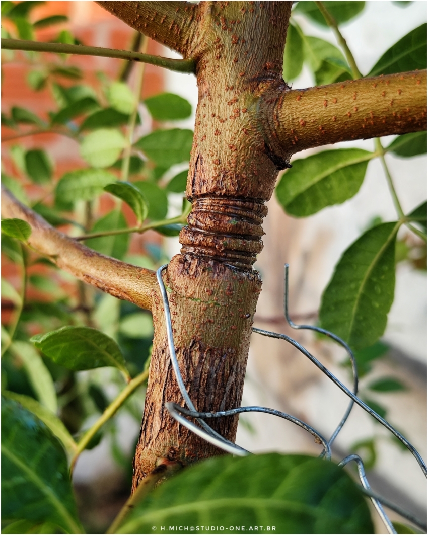 minhas aroeiras cresceram muito rápido, essa já alcançou três metros, mas o tronco estava muito fino, enrolei arame na altura de 1m e a parte inferior engrossou bastante, no pé dele já está com 6 cm de diâmetro agora e acredito o risco de quebrar diminuiu, soltei o arame hoje e vou observar… Leia mais: estrangulei eela …